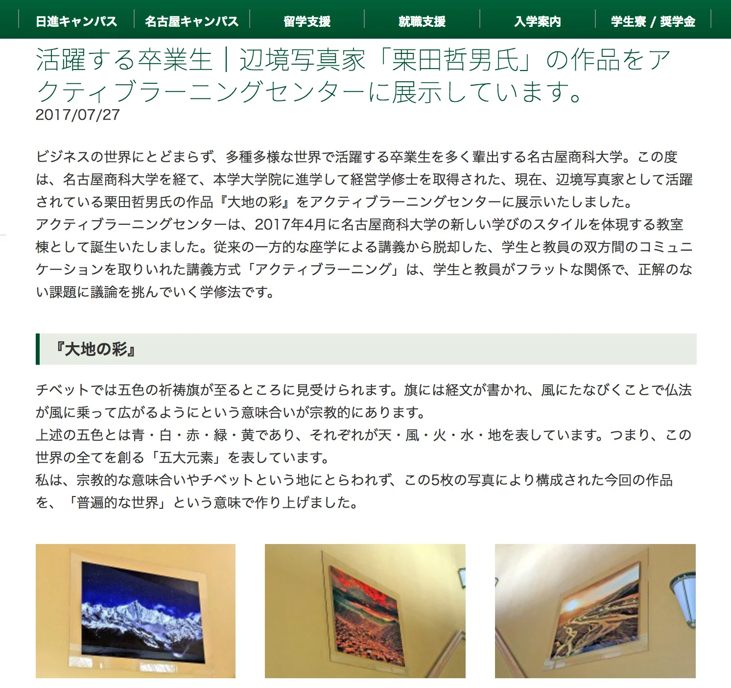 5枚の写真により構成される作品『大地の彩』をご購入いただき、展示いただいている名古屋商科大学様のオフィシャルサイトに、作品のご紹介等を掲載いただきました。